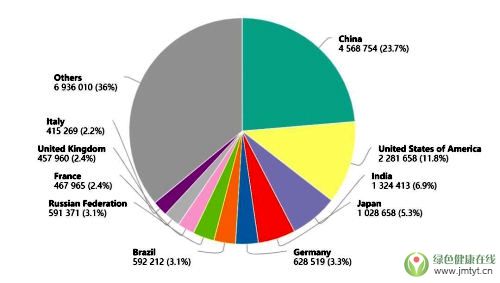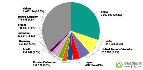 中國300萬,印度85萬,美國61萬,日本42萬,俄羅斯31萬,巴西26萬,