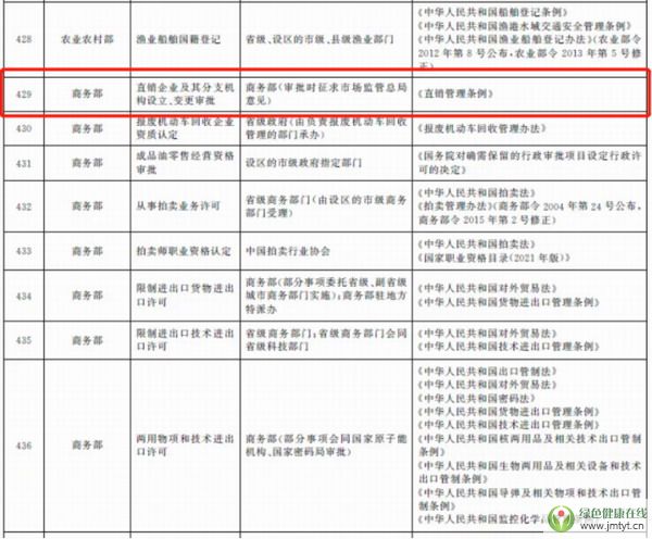近日,國務(wù)院辦公廳印發(fā)的《關(guān)于全面實行行政許可事項清單管理的通知》(以下簡稱《通知》),就可以回答這個問題。其中,商務(wù)部共有18項工作被列入清單當中,其中第429項是關(guān)于“直銷企業(yè)及其分支機構(gòu)設(shè)立、變更審批”的,這里明確指明,審批部門是商務(wù)部(審批時征求市場監(jiān)管總局意見),依據(jù)是《直銷管理條例》。