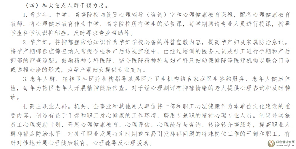 四是加大重點人群干預(yù)力度。針對青少年、孕產(chǎn)婦、老年人、高壓職業(yè)人群,分別提出心理健康服務(wù)措施。