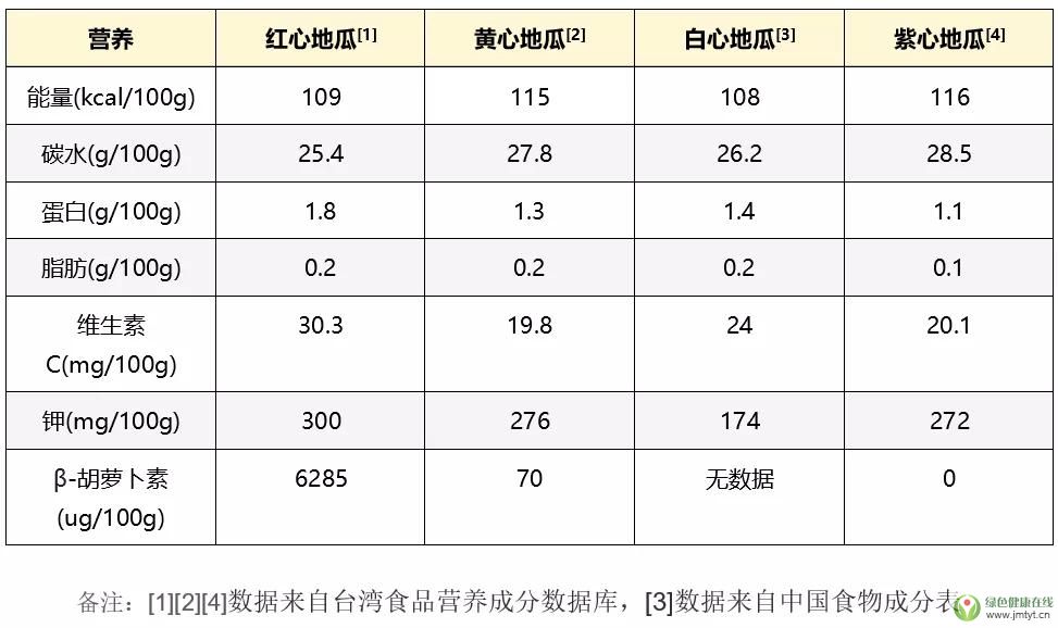 由表可知,不同果肉的能量、碳水、脂肪、蛋白含量差不多,不過紅心地瓜最補(bǔ)β-胡蘿卜素、維生素C、鉀,紫薯最補(bǔ)花青素。